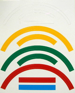 Yellow, red, green and white, pressure sensitive. Just pull off backing and place on instrument lens.